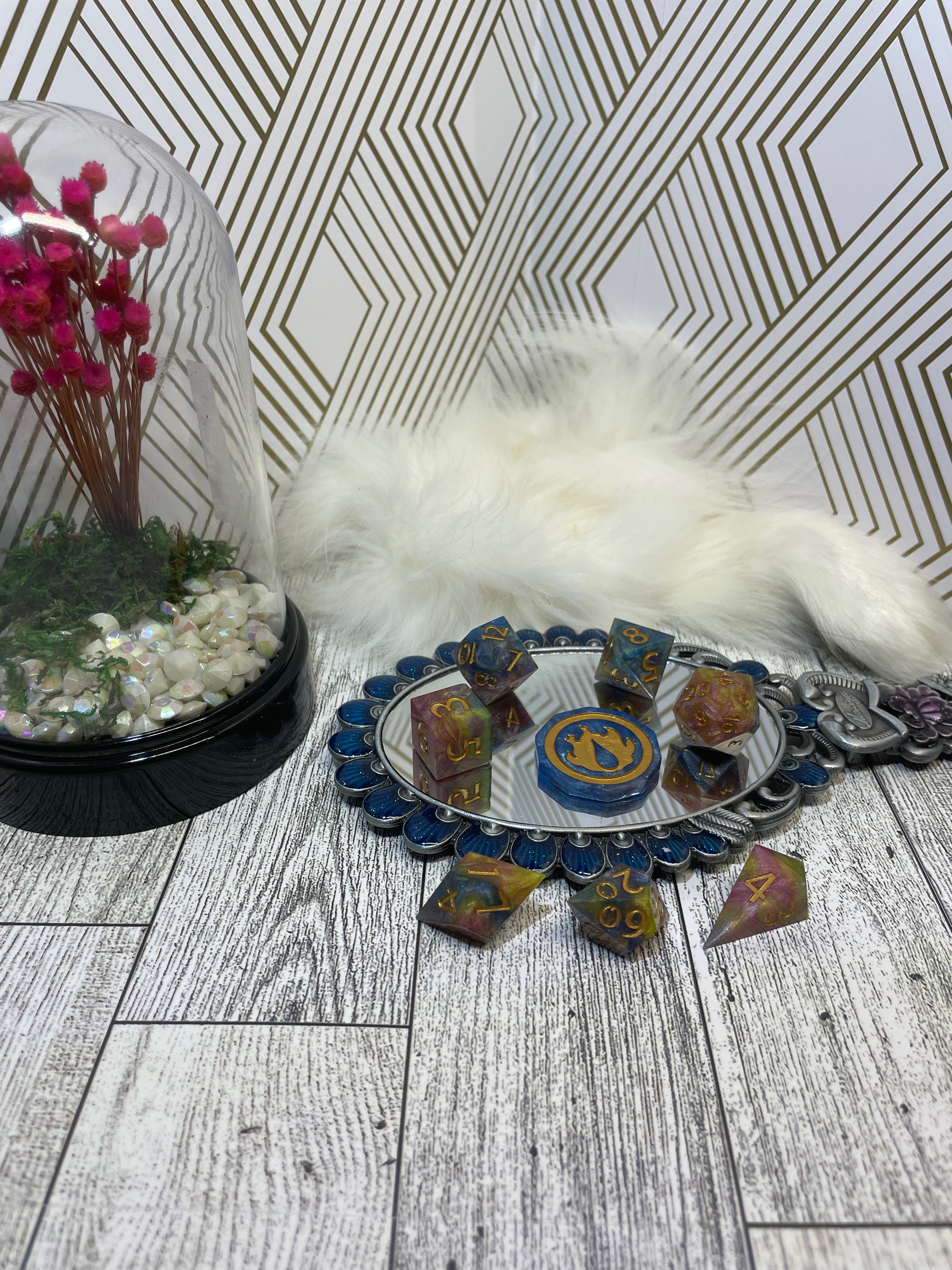 All Dice Sorcerer dice are handmade start to finish. As such there may be minor flaws and slight differences from the dice pictured. Set of 8 unique shaped dice, designed by the Dice Sorcerer herself. The dice include a traditional D20, rhombic D12, pointed D%, pointed D10, traditional D8, traditional D6, pointed D4 and a custom coin with the Dice Sorcerer logo on one side.