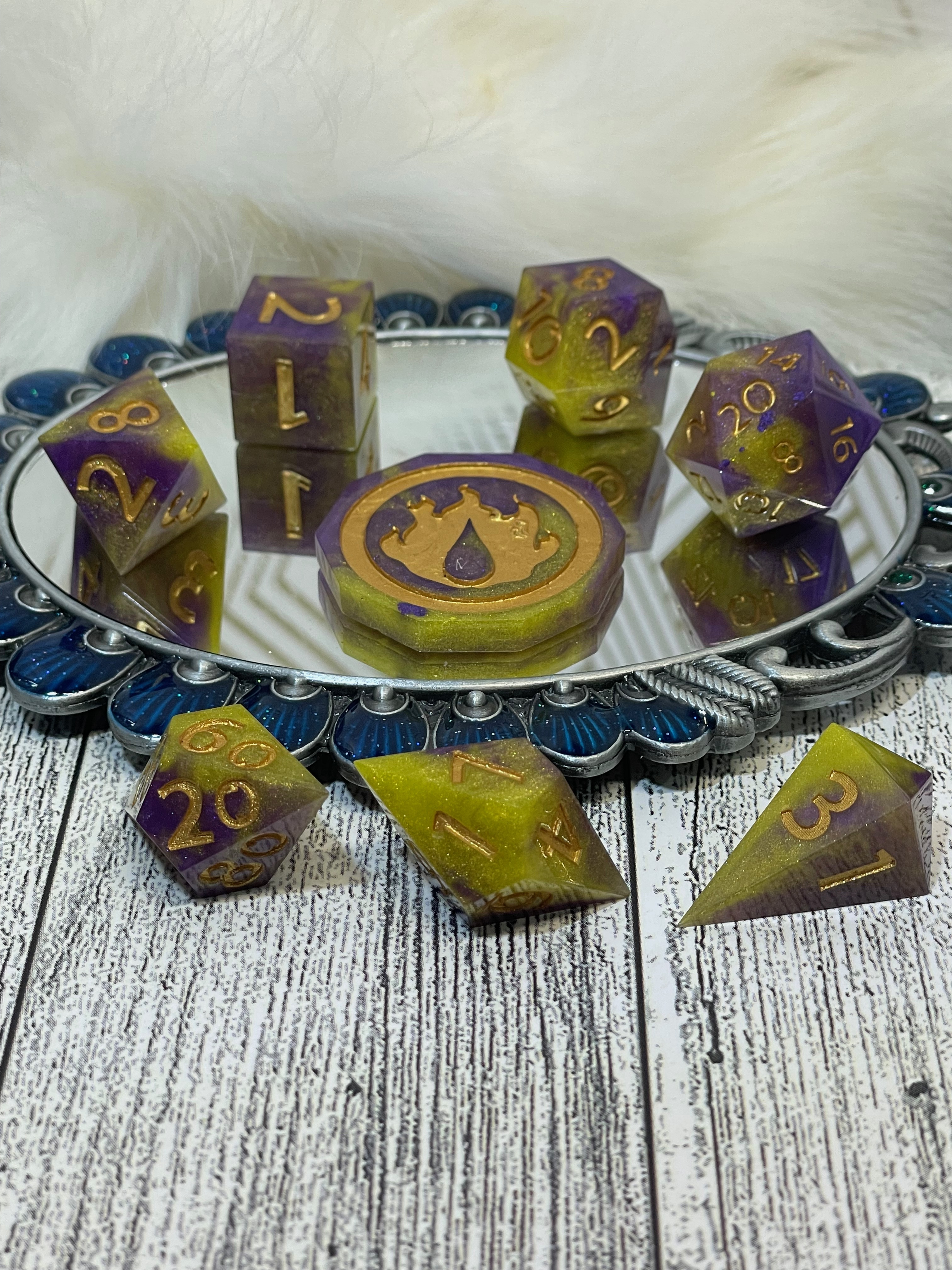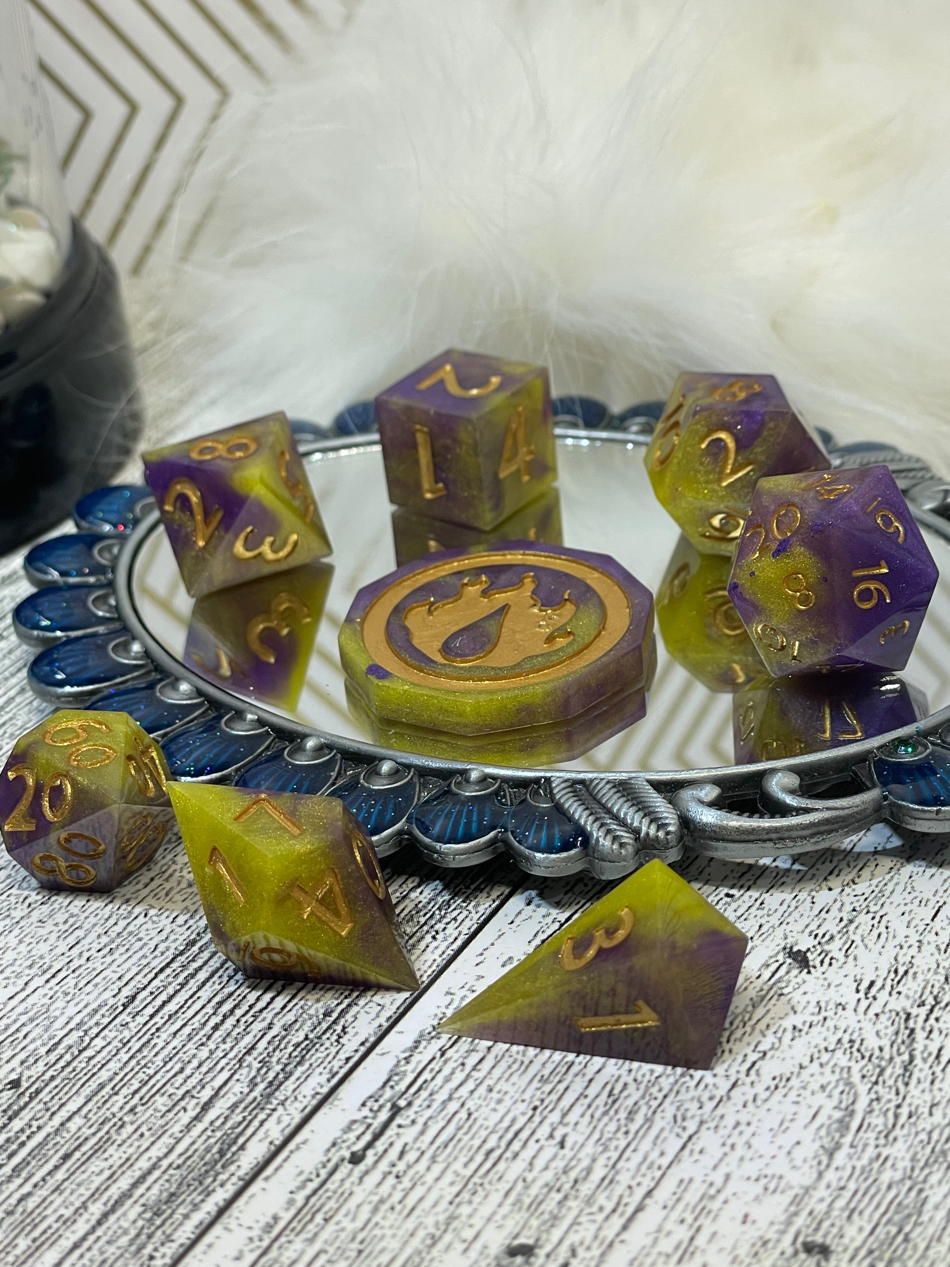 All Dice Sorcerer dice are handmade start to finish. As such there may be minor flaws and slight differences from the dice pictured. Set of 8 unique shaped dice, designed by the Dice Sorcerer herself. The dice include a traditional D20, rhombic D12, pointed D%, pointed D10, traditional D8, traditional D6, pointed D4 and a custom coin with the Dice Sorcerer logo on one side.