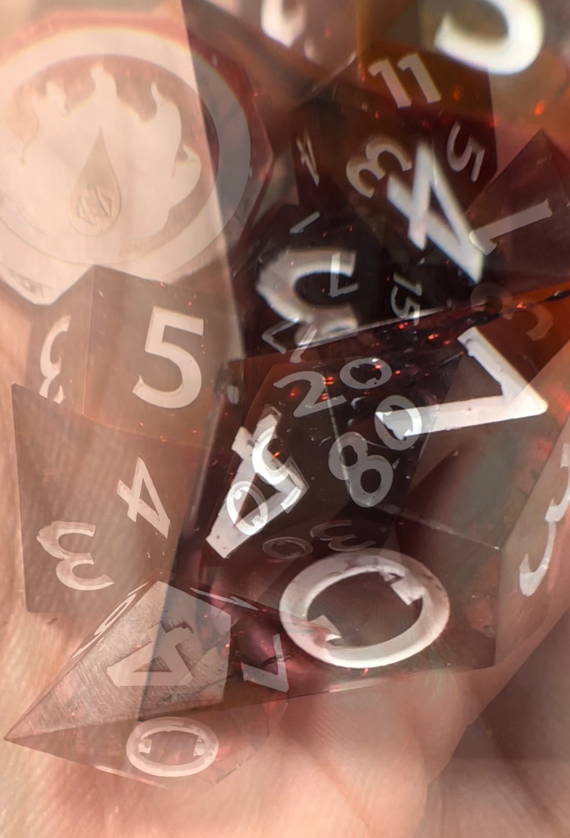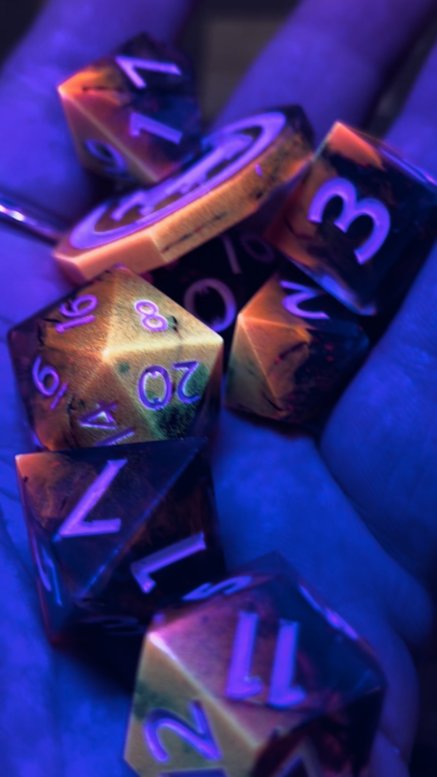 This listing is for a Preorder, the original run will include 50 sets and will be fulfilled beginning in October. All Dice Sorcerer dice are hand made start to finish. As such there may be minor flaws and slight differences from the dice pictured. Set of 8 unique shaped dice, designed by the Dice Sorcerer herself. The dice include a traditional D20, rhombic D12, pointed D%, pointed D10, traditional D8, traditional D6, pointed D4 and a custom coin with the Dice Sorcerer logo on one side.